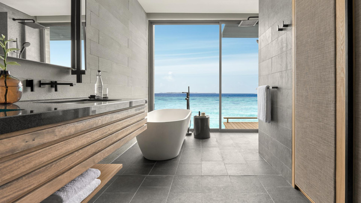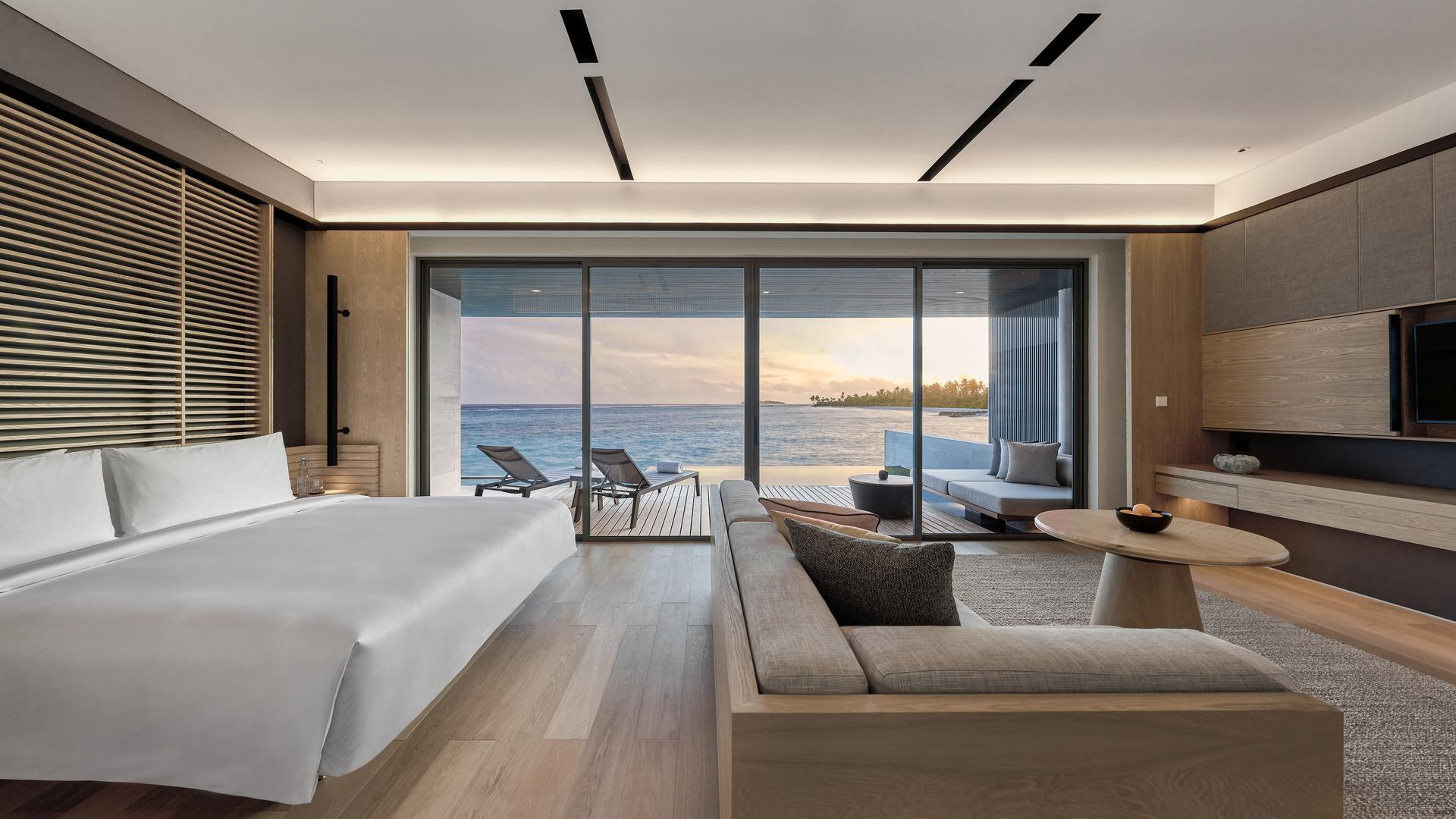 Óceán víz feletti medencés villa: 121-150 nm, vízi bungaló (cölöpökön a lagúna felett), lagúnára néző, nappali/hálószoba, zuhanyzó, fürdőkád, hajszárító, minibár térítés ellenében, széf, TV, WiFi, kávé/tea, terasz (bútorozott), közvetlen hozzáférés a strandhoz, saját medence, inasszolgálat