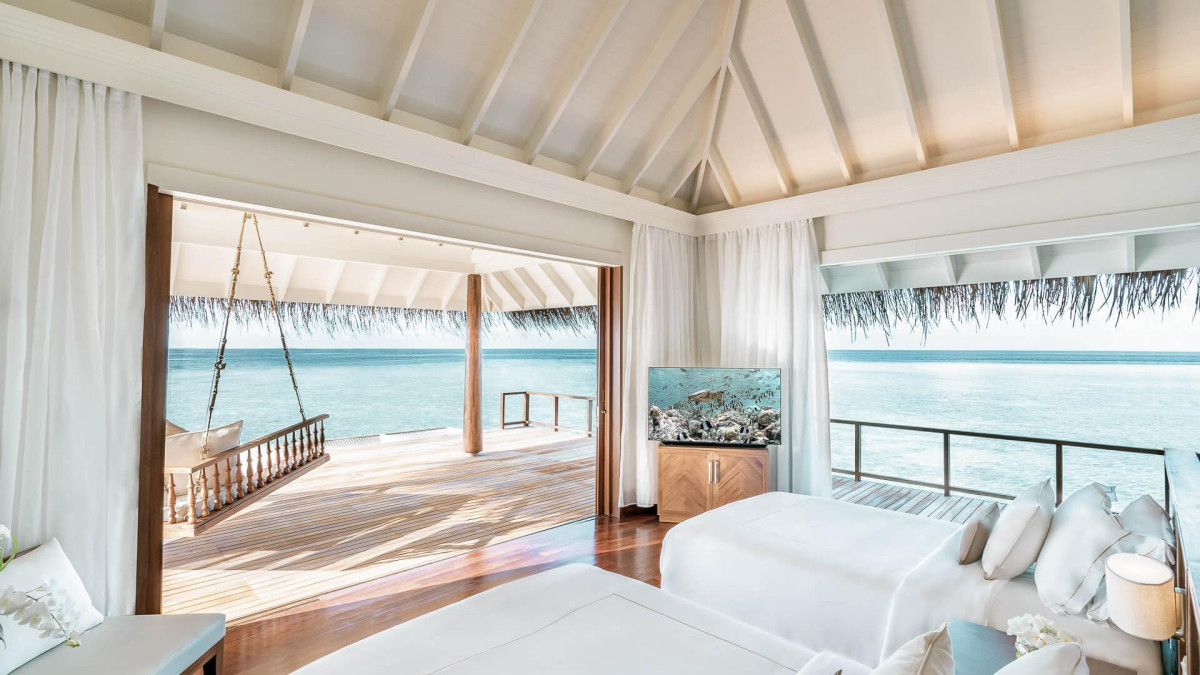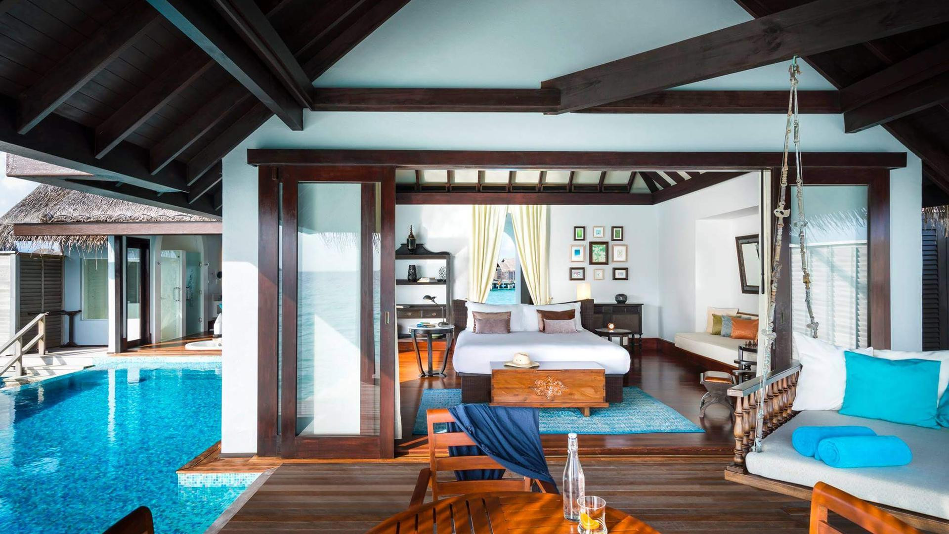 Víz feletti Pool Villa kb 259 nm (kb. 150 nm lakóterület): Cölöpökön a Lagúna épült. Napozóterasz medencével (kb. 4 x 7 méter). Lazíts egyet a víz fölé kifeszített hálóban. A fürdőszobában üvegpadló. Vízi bungaló, nemdohányzó szoba, tengerre néző, kb. 259 m², összesen szobaszám ebben a szobatípusban: 1, elrendezése: kombinált nappali/hálószoba, 1 king-size ágy, babaágy: ingyenes, klíma : ingyenes, egyénileg szabályozható, széf: ingyenes, mennyezeti ventilátor, íróasztal, kávéfőző, Nespresso gép, vízforraló, minibár: térítés ellenében, telefon, Internet: WLAN/WiFi: ingyenes, TV: síkképernyős, a hálószobában, német csatornák, kábeltévé, DVD lejátszó, CD lejátszó, iPod dokkoló, szobaszerviz: térítés ellenében, komornyik szolgáltatás: térítésmentes, takarítás: díjmentes, zuhanyzó, külön zuhanyzó, kültéri zuhanyzó, esőzuhany, fürdőkád a szobában, WC, fürdőköpeny: ingyenes, Papucs: ingyenes, hajszárító, kozmetikai tükör, terasz: nyugágyakkal, nyugágyakkal, ülőalkalmatosság, közvetlen medencekapcsolattal, saját medence, saját kerttel