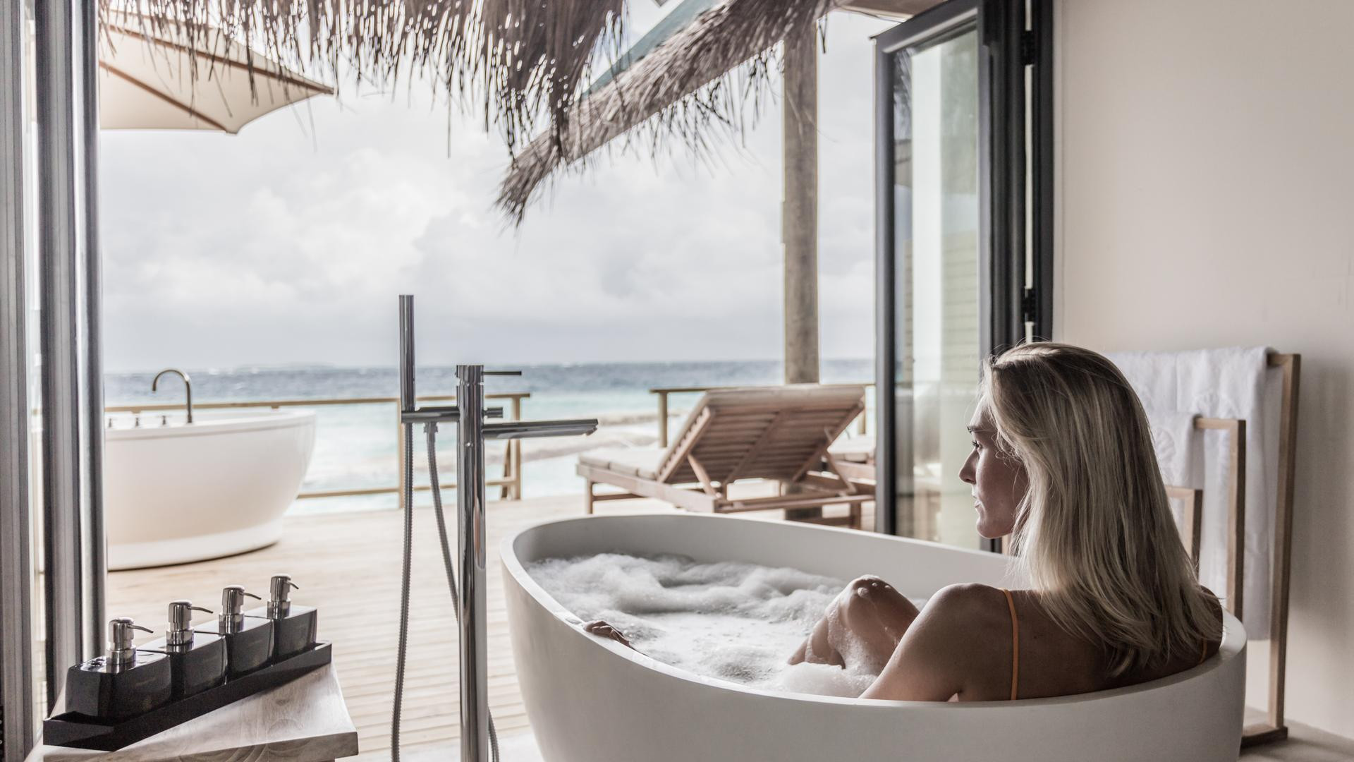 Beach Villa Sunrise 91-100 nm, villa, különálló, tengerparti fekvésű, napfelkelte felőli oldalon, félig nyitott fürdőszoba, kültéri fürdőkád, esőzuhany, kültéri zuhanyzó, wc, fürdőköpeny, hajszárító, légkondi, ventilátor, minibár térítés ellenében, széf, vasaló, TV , WiFi, vízforraló, kávé/tea, terasz (bútorozott), közvetlen strandkapcsolat