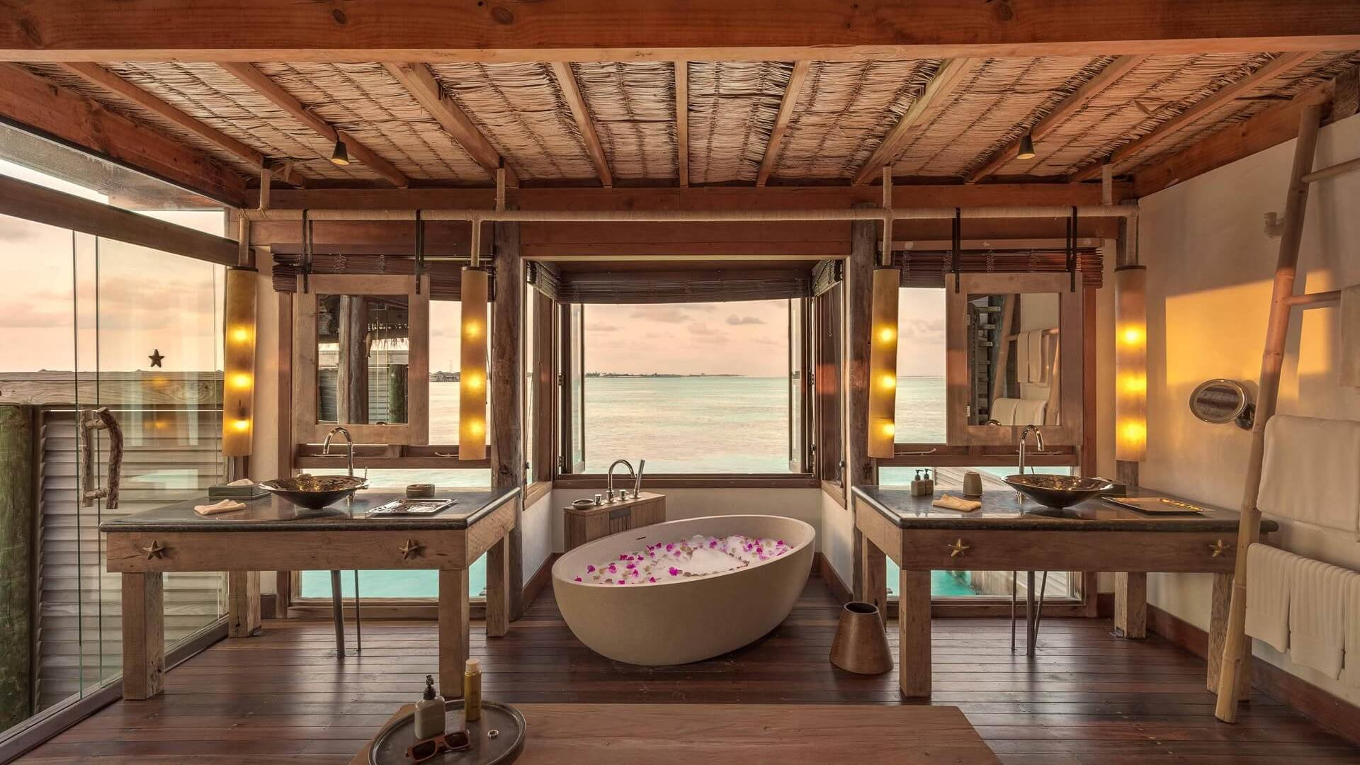 Szoba kapacitás: 2 felnőtt + 4 gyermek vagy 6 felnőtt, vízre épült luxusvilla, közvetlen lejárat az óceánba, maximális privát szféra, 2 hálószoba, hatalmas légkondicionált nappali pihenőágyakkal, étkezővel, privát gym, gőzszoba, privát tetőtéri terasz pihenőágyakkal, étkezővel, jacuzzival, félig nyitott fürdőszoba szeparált zuhanyzóval, víz feletti terasz napozóágyakkal