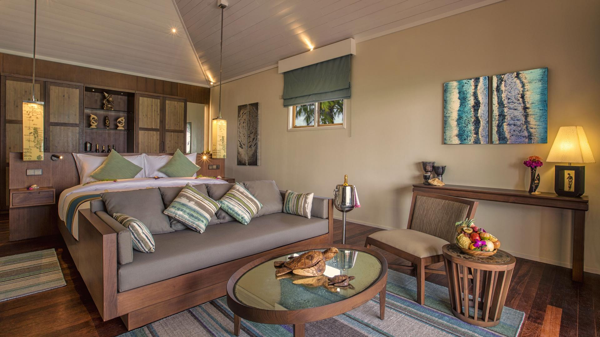 Ocean villa 101-120 nm, családi ház, vízi bungaló (cölöpökön a lagúna felett), tengerre néző, nappali/hálószoba, esőzuhany, WC, fürdőköpeny, papucs, hajszárító, fapadló, légkondi, ventilátor, minibár térítés ellenében , széf, TV, zenei rendszer, WiFi , kávéfőző, kávé/tea, terasz (bútorozva), közvetlen kijárat a tengerhez
