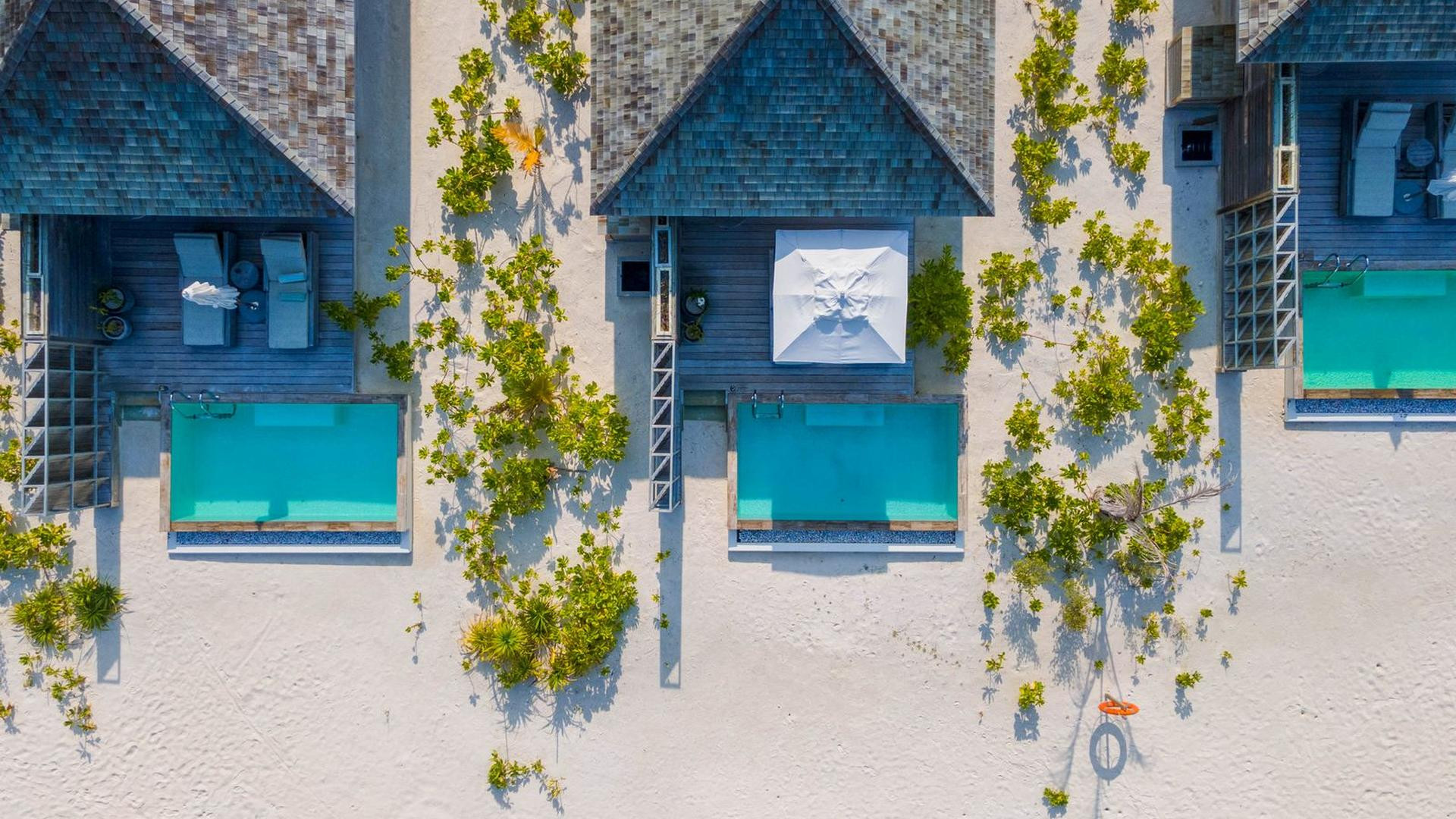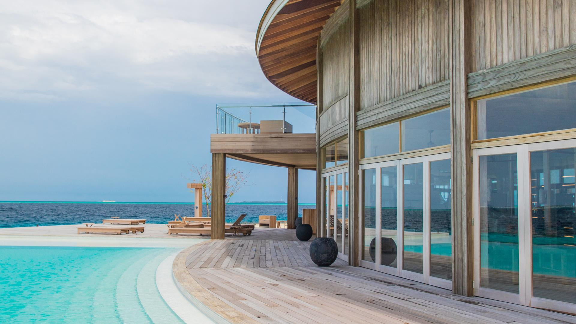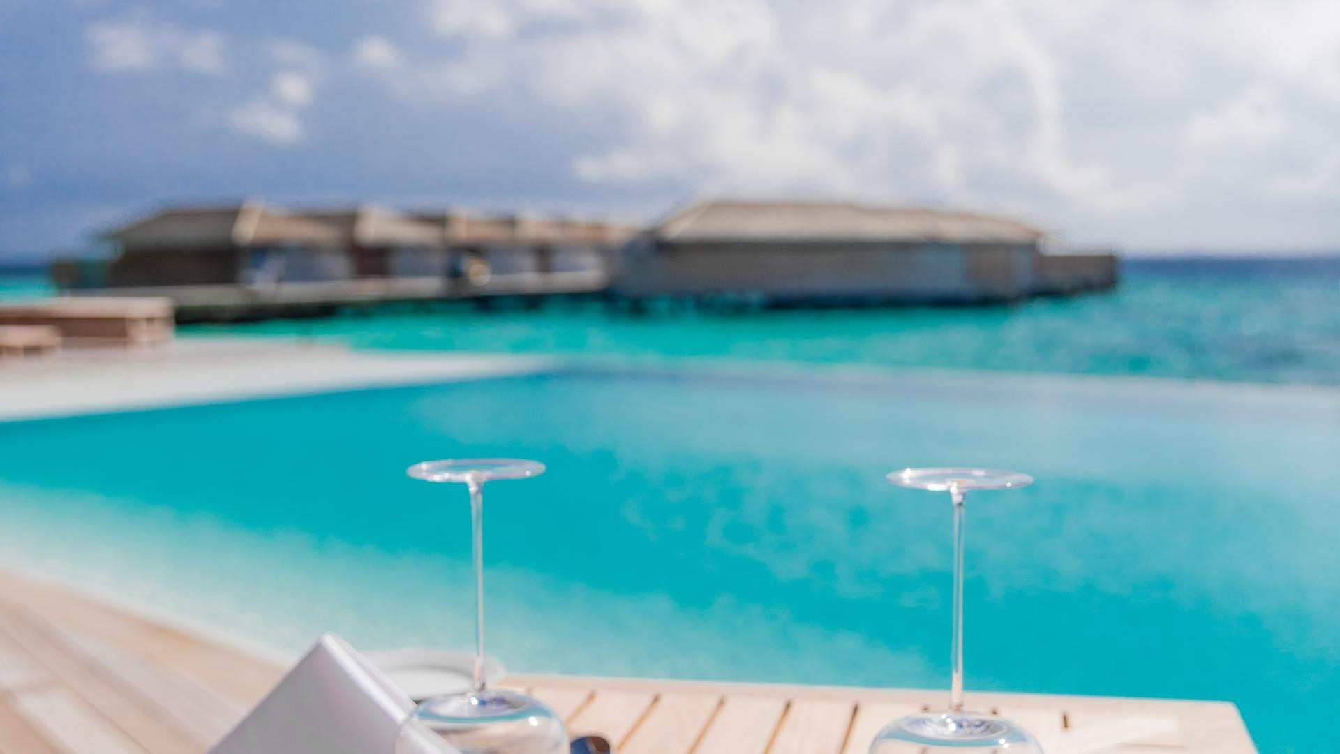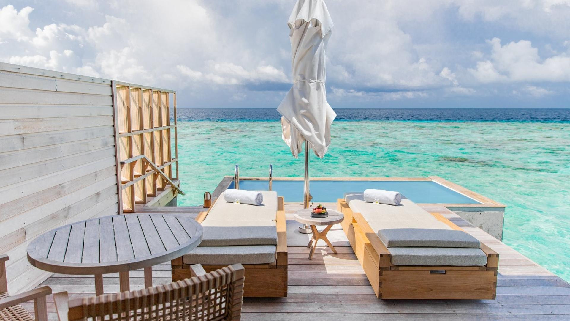 Ocean Pool villa 101-120 nm, vízi bungaló (cölöpökön a lagúnán), kilátással a tengerre, nappali/hálószoba, zuhanyzó, kültéri kád, kültéri zuhanyzó, wc, hajszárító, fapadló, légkondicionálás, ventilátor, minibár térítés ellenében, széf, TV, WiFi, vízforraló, kávéfőző, kávé/tea, terasz (bútorozott), közvetlen kijárat a tengerhez, saját medence