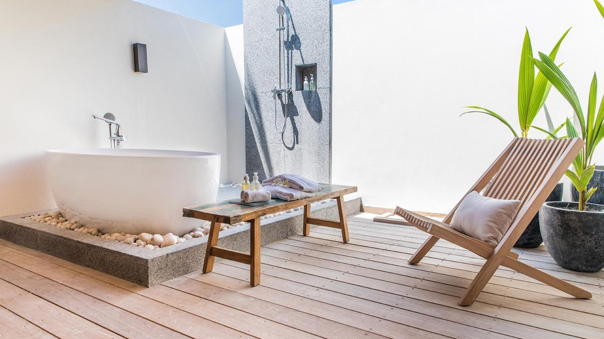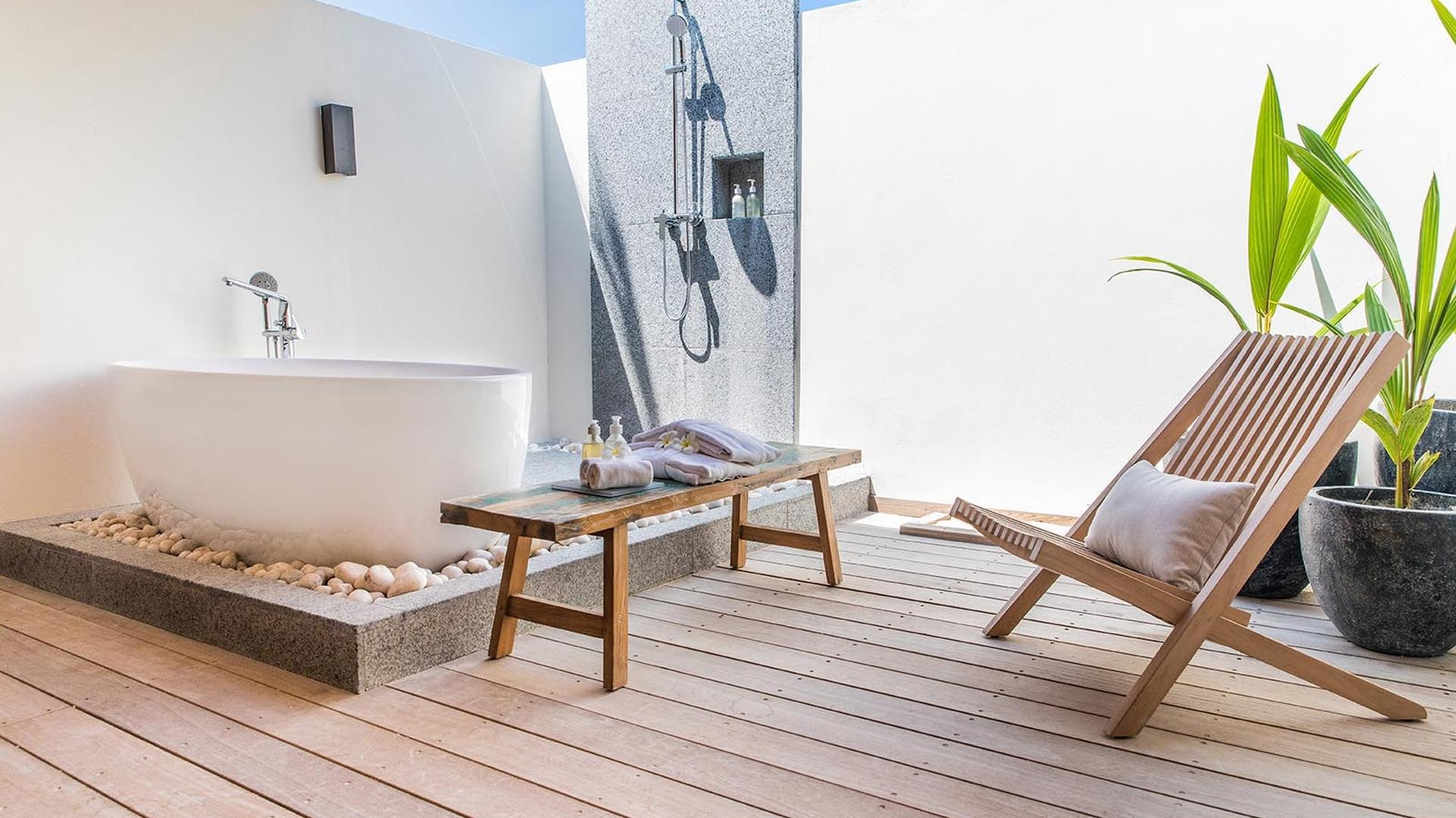 Beach Villa 101-120 nm, tengerparti elhelyezkedés, nappali/hálószoba kombinált nappali/hálószoba, zuhanyzó, kültéri kád, kültéri zuhanyzó, wc, hajszárító, fapadló, légkondicionáló, ventilátor, minibár térítés ellenében, széf, TV, WiFi, vízforraló, kávéfőző , kávé/tea, terasz (bútorozott) , közvetlen hozzáférés a strandhoz, saját medence