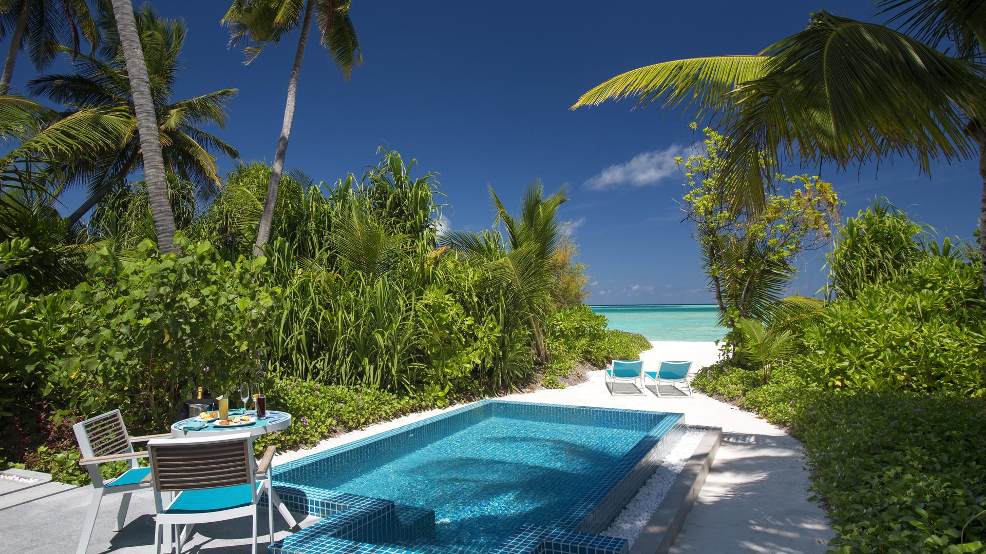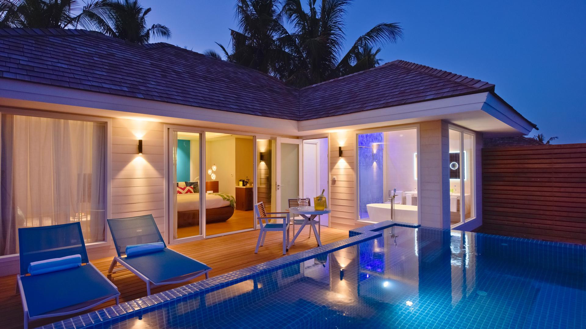 Ocean Pool villa 81-90 nm, családi ház, cölöpökön a sziget mellett, félig a tengerparton, félig víz felett, tengerre néző, fürdőkád, esőzuhany, wc, hajszárító, klíma, ventilátor, minibár térítés ellenében, széf, tv , vízforraló, kávé/tea, terasz (bútorozott), saját medence