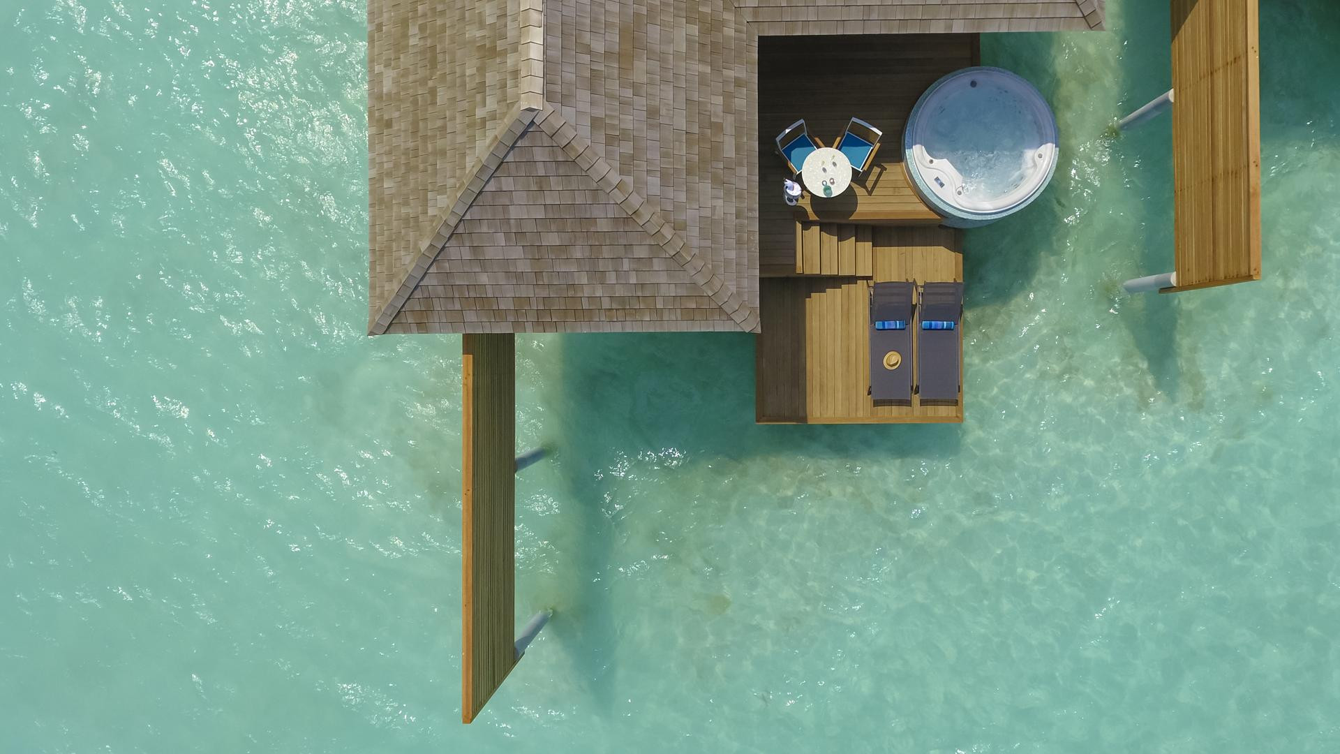 Aqua villa jakuzzival 71-80 nm, családi ház, vízi bungaló (cölöpökön a lagúnán), kilátás a tengerre, fürdőkád, esőzuhany, WC, hajszárító, légkondicionáló, ventilátor, minibár térítés ellenében, széf, TV, vízforraló, kávé/tea , terasz (bútorozva), közvetlen kijárat a tengerre, jacuzzi