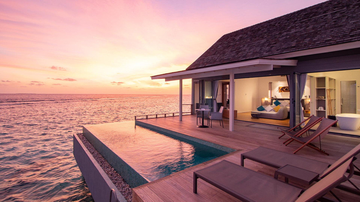 Water Villa medencével (BUM4), vízi bungaló, nemdohányzó szoba, kilátás a tengerre, kilátás a tengerre, kb. 142 m², utolsó teljes felújítás: 2016, a szobatípusok száma ebben a szobatípusban: 1, elosztása a következőképpen: kombinált nappali / hálószoba, 1 king-size ágy, Légkondicionálás: egyedileg állítható, padló: parketta, széf: ingyenes, mennyezeti ventilátor, kanapé, íróasztal, vasaló, vasalódeszka, Nespresso gép, kávé- / teafőző, vízforraló, minibár: egy díj, üdítők: térítés ellenében, az all inclusive ellátással, víz: térítés ellenében, az all inclusive ellátással együtt, alkoholos italok: térítés ellenében, snackek: térítés ellenében, minibár feltöltése, telefon, Internet: WLAN / WiFi: ingyenes térítés ellenében: TV: síkképernyős, Deutsche Welle, kábel-TV, iPod-dokkoló, takarítási szolgáltatás: naponta, ingyenes, külön zuhanyzó, kültéri zuhany, fürdőkád, WC, fürdőköpeny: ingyenes, üvegfalakkal elválasztott fürdőszoba, hajszárító, kozmetikai tükör, terasz: nyugágyakkal, nyugágyakkal, ülősarokkal, zuhanyzóval che, saját medencével