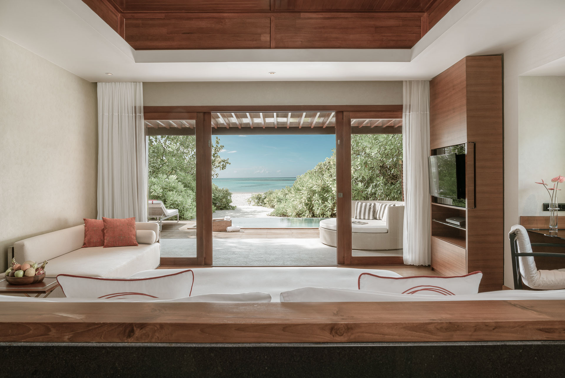 Beach Pool villa 151-200 nm, családi ház, tengerparti fekvésű, tengerre néző, félig nyitott fürdőszoba, zuhanyzó, kád, kinti zuhanyzó, wc, fürdőköpeny, papucs, hajszárító, klíma, minibár térítés ellenében, széf, TV, DVD lejátszó, WiFi, vízforraló, kávéfőző, kávé/tea, terasz (bútorozott), közvetlen strandhozzáférés, saját medence