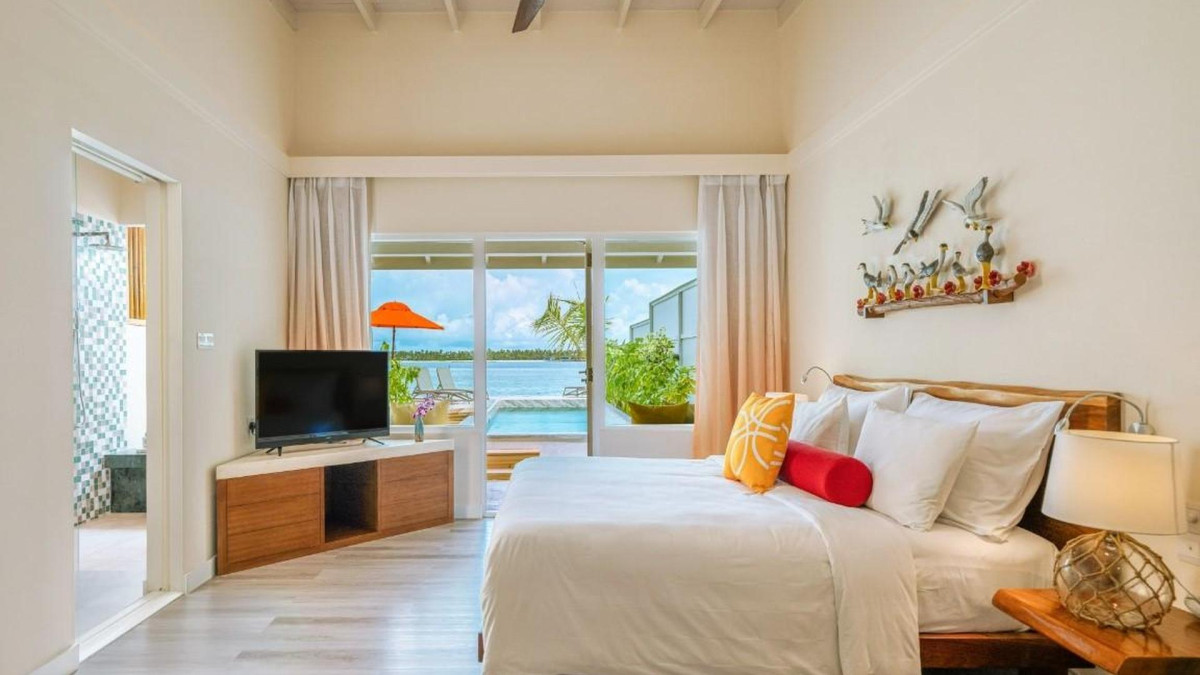 Napfelkelteparti vízparti villa medencével 81-90 m²-es, különálló villa, napfelkelte felőli oldalon, vízparti bungaló (cölöpökön a lagúna felett), tengerre néző, öltöző, zuhanyzó, WC, fürdőköpeny, hajszárító, légkondicionáló, ventilátor, minibár (naponta feltöltve), üdítők, ásványvíz, széf, TV, Wi-Fi, vízforraló, kávé/tea, bútorozott terasz, közvetlen tengerparti kijárat, saját medence