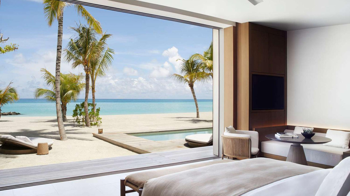 Beach Pool villa 151-200 nm, családi ház, napkelte oldal, tengerre néző, 1 fürdőszoba, fürdőkád, esőzuhany, WC, minibár térítés ellenében, TV, WiFi, vízforraló, kávé/tea, terasz (bútorozott), közvetlen strandkapcsolat, saját medence