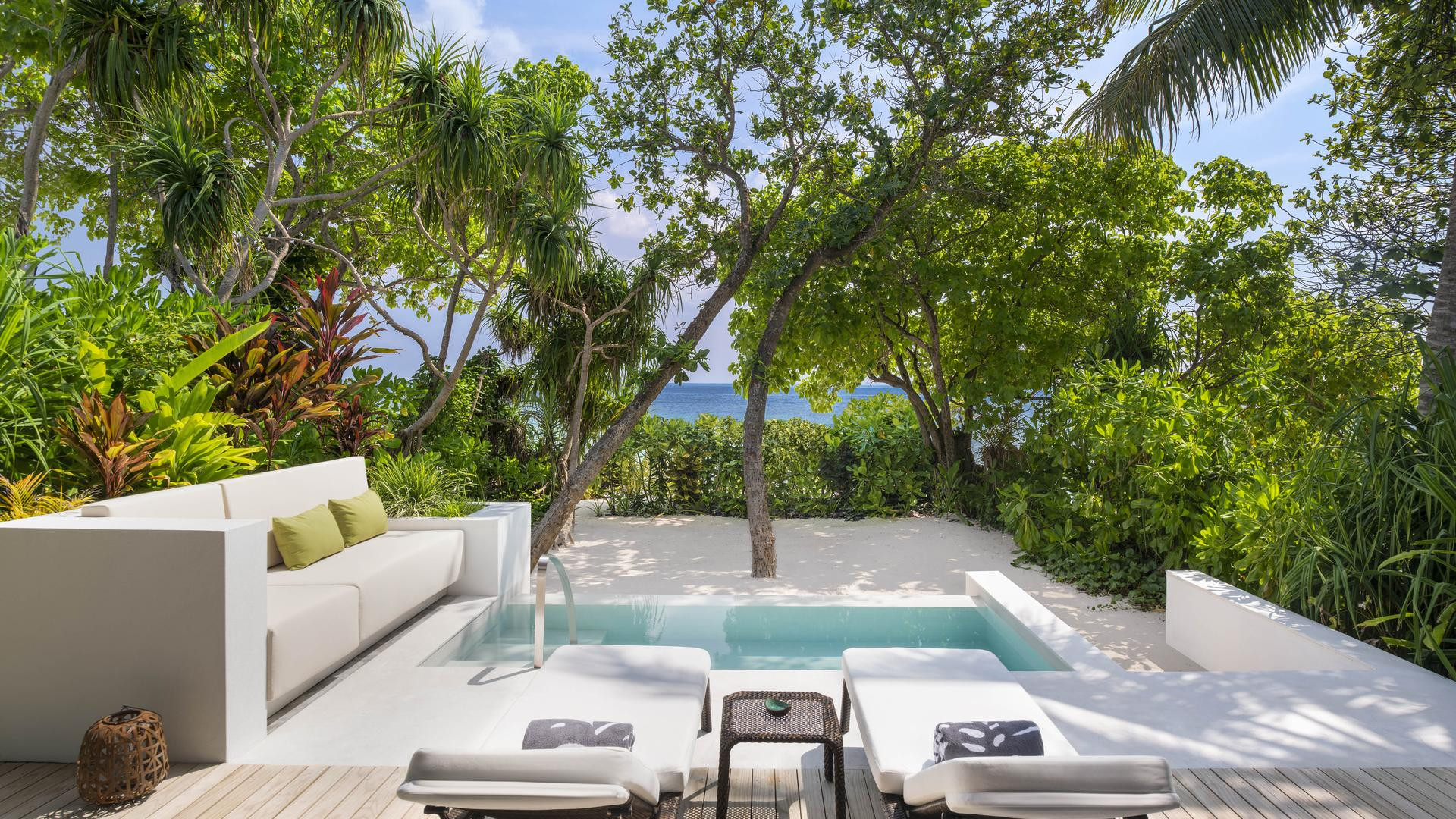 Beach Villa Pool 121-150 nm, egyágyas ház, tengerre néző, franciaágy (king size), zuhanyzó, fürdőkád, kültéri zuhanyzó, wc, hajszárító, légkondi, ventilátor, minibár térítés ellenében, széf, TV, WiFi, vízforraló, kávéfőző, kávé/tea, terasz (bútorozott), közvetlen strandkapcsolat, saját medence