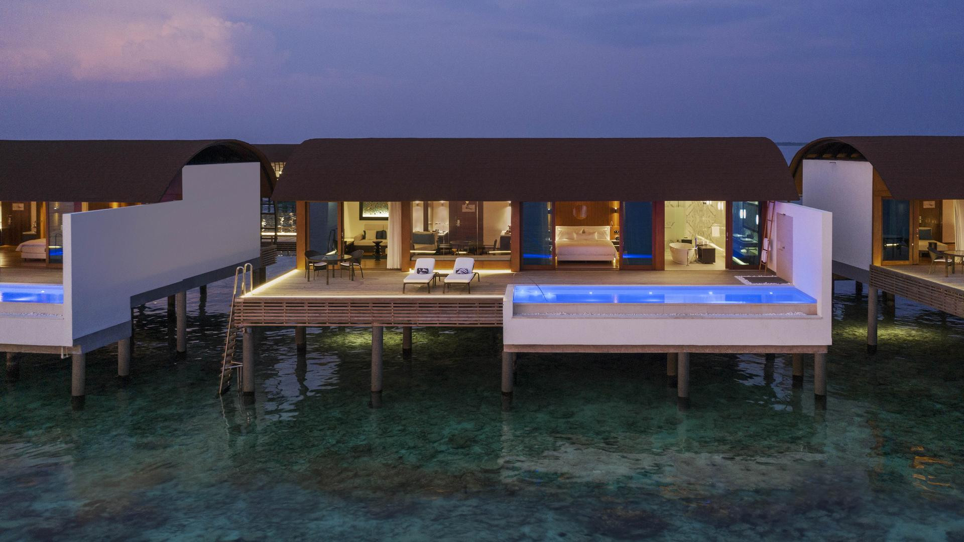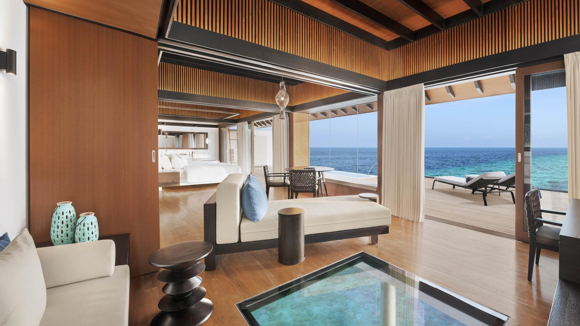 A Overwater Villas Pool padlóba ágyazott üvegablakkal rendelkezik a víz alatti világ megfigyelésére.