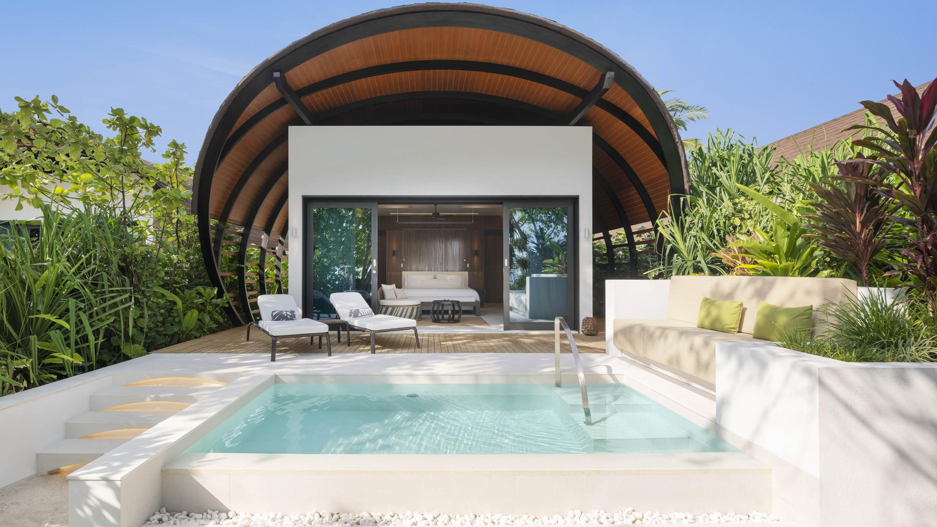 Deluxe Beach Villa Pool 151-200 nm, egyágyas ház, tengerre néző, külön nappali, külön hálószoba, franciaágy (king size), zuhanyzó, fürdőkád, kültéri zuhany, WC, hajszárító, klíma, ventilátor, minibár térítés ellenében, széf, TV, WiFi, vízforraló, kávéfőző, kávé/tea, terasz (bútorozott), közvetlen strand-hozzáférés, saját medence