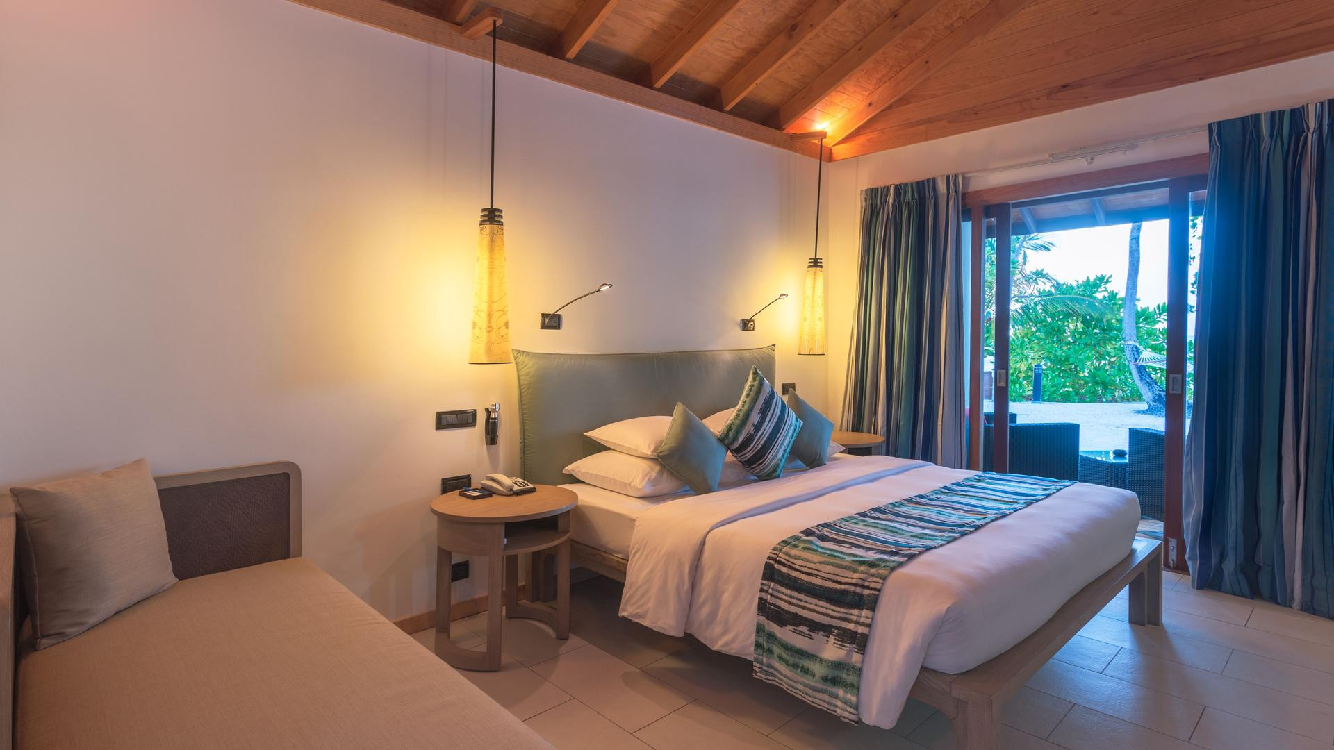 Jacuzzi Beach Villa, villa, alsó szoba életkora: 18 év, első sor a strand felé, tengerre néző, tengerre néző, lagúnára néző, kb 65 m², összesen szobaszám ebben a szobatípusban: 1, elrendezése a következő : nappali/hálószoba, klíma : ingyenes, egyénileg szabályozható, hideg, padló: parketta, széf: ingyenes, mennyezeti ventilátor, kanapé, kávé/teafőző, vízforraló, minibár: térítés ellenében, üdítő: térítés ellenében, víz: térítés ellenében, alkoholos italok: térítés ellenében, Snack: térítés ellenében, minibár újratöltve: naponta, telefon, Internet: WLAN/WiFi: ingyenes, TV: a hálószobában, kábeltévé, DVD lejátszó, CD lejátszó, iPod dokkoló, szobaszerviz: térítés ellenében, takarítás: díjmentes