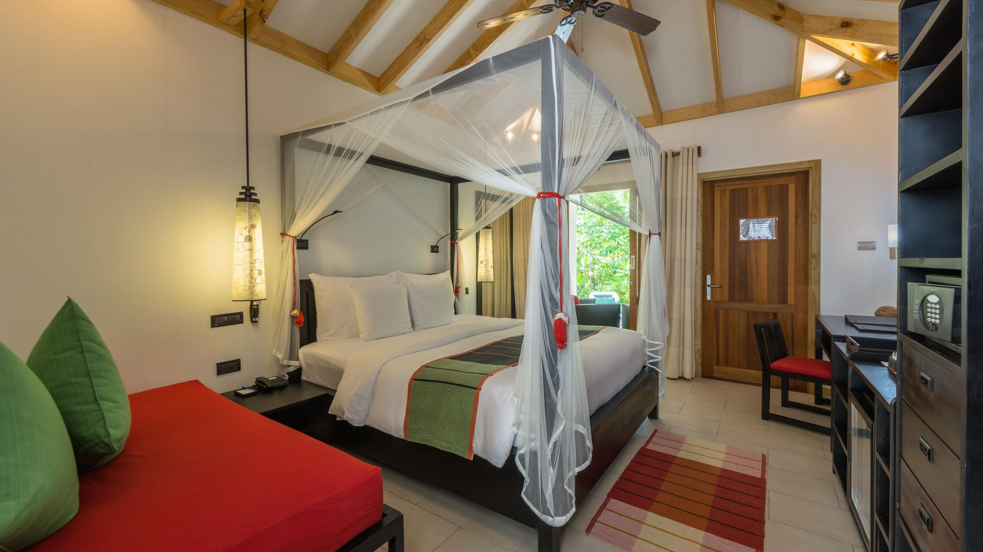 Szomszédos Beach Villa, villa, tengerre néző, tengerre néző, lagúnára néző, kb. 55 m², összesen szobaszám ebben a szobatípusban: 1, elrendezése a következő: kombinált nappali/hálószoba, kiságy: nincs díj, kérésre szükséges, előjegyzés nem szükséges , klíma: ingyenes, egyénileg szabályozható, hideg, padló: parketta, széf: ingyenes, mennyezeti ventilátor, kanapé, kávé/teafőző, vízforraló, minibár: térítés ellenében, üdítők: a térítés ellenében, víz: térítés ellenében, alkoholos italok: térítés ellenében, harapnivalók: térítés ellenében, minibár feltöltése: naponta, telefon, Internet: WLAN/WiFi: térítésmentes, TV: a hálószobában, kábeltévé, DVD lejátszó , CD lejátszó, szobaszerviz: térítés ellenében, takarítás: ingyenes, zuhanyzó , esőzuhany, WC, fürdőköpeny: ingyenes, hajszárító, terasz: nyugágyakkal, ülőgarnitúrával, veranda