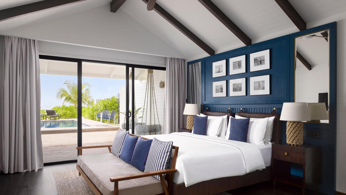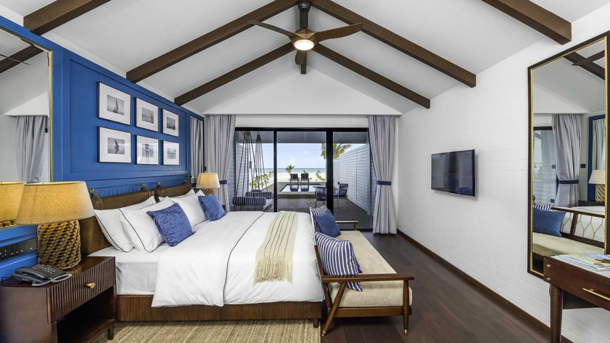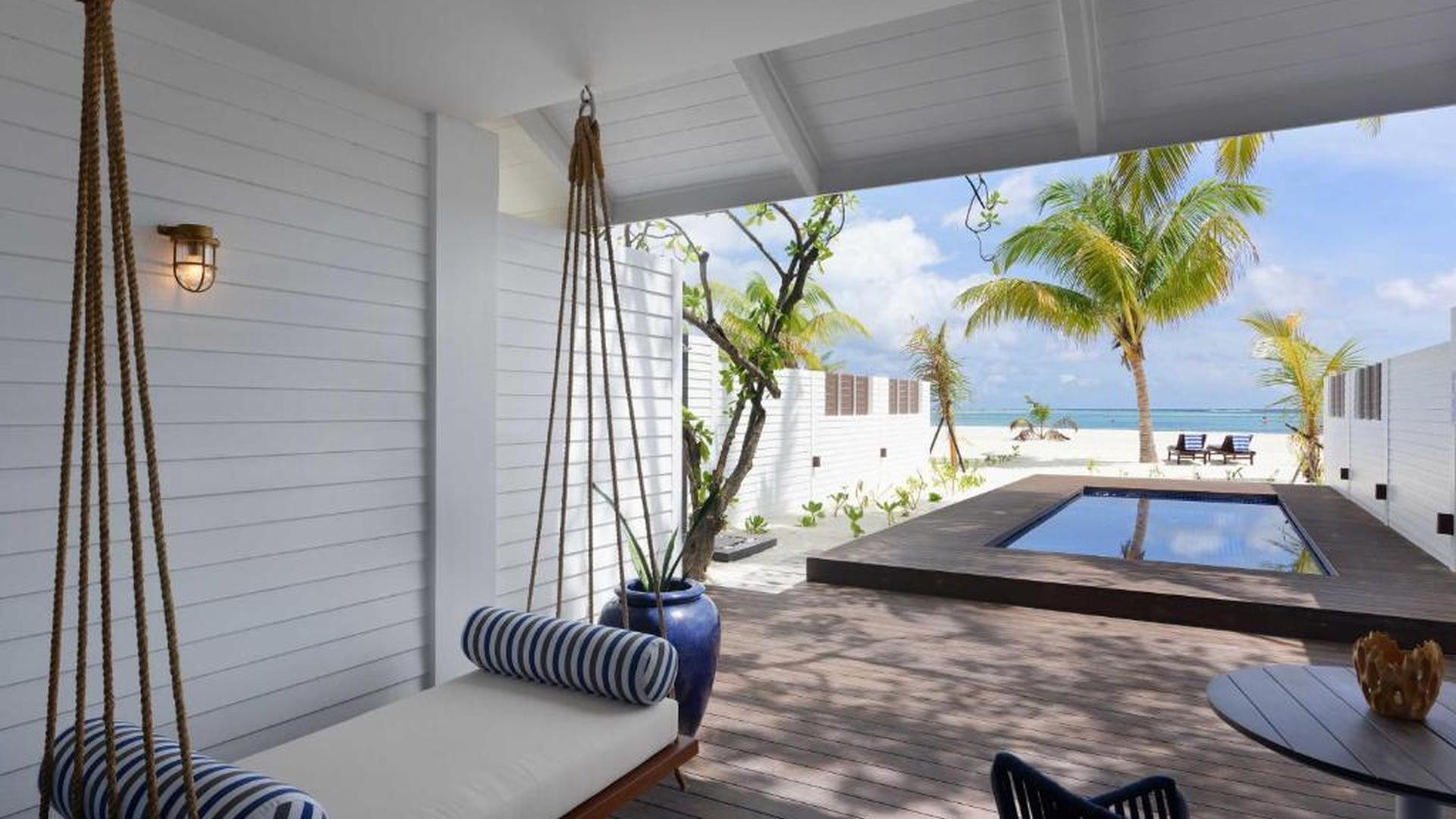 Deluxe Beach Pool villa 121-150 nm-es, ikerház, tengerparti fekvésű, tengerre néző, felújított, zuhanyzó, fürdőkád, kültéri zuhanyzó, wc, fürdőköpeny, hajszárító, klíma, ventilátor, minibár térítés ellenében, széf, tv, WiFi, vízforraló, kávé/tea, terasz (bútorozott), saját medence