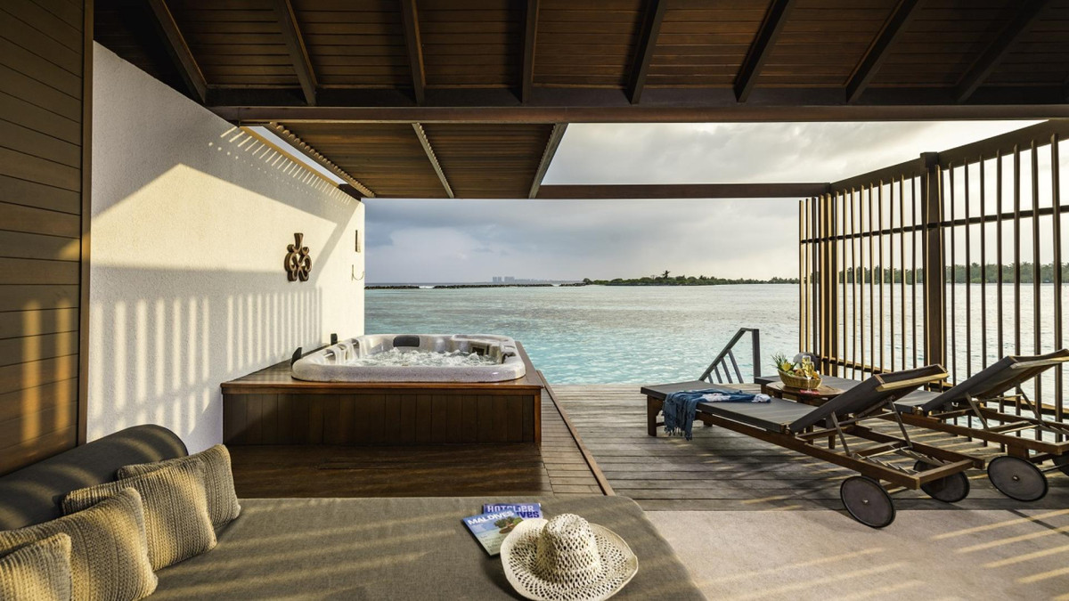 Vízi villa jakuzzival 81-90 nm, ikerház, vízi bungaló (cölöpökön a lagúnán), kilátással a tengerre, zuhanyzó, WC, fürdőköpeny, hajszárító, légkondi, ventilátor, minibár térítés ellenében, széf, TV, WiFi, vízforraló, eszpresszó gép, kávé/tea, terasz (bútorozva), közvetlen kijárat a tengerhez, pezsgőfürdő