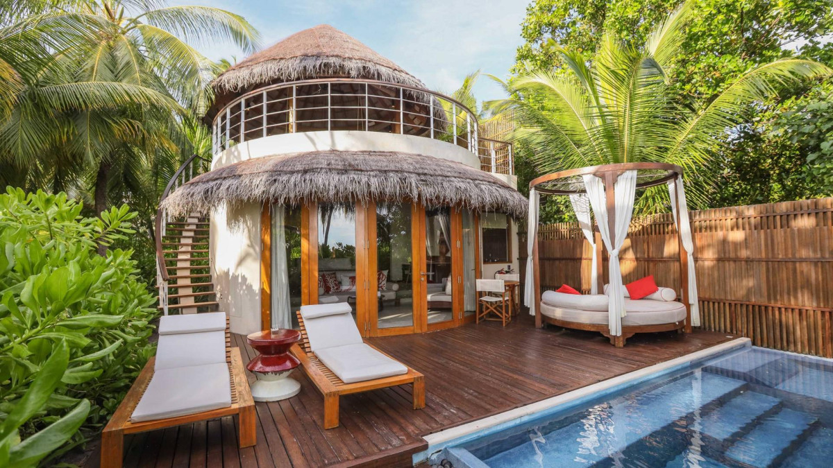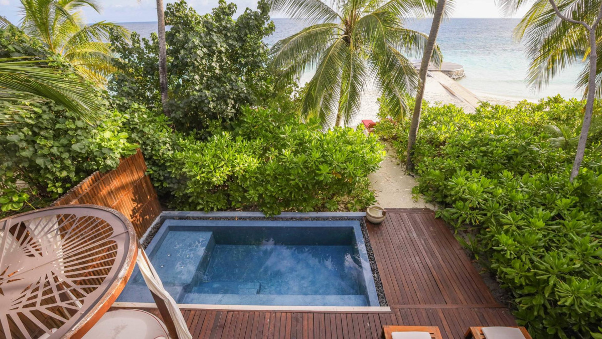 Csodálatos Beach Oasis Villa (27) kb.188 nm (kültéri területtel együtt): Közvetlenül a tengerparton félig nyitott fürdőszobával és saját merülőmedencével, valamint hintaszékes tetőterasszal.